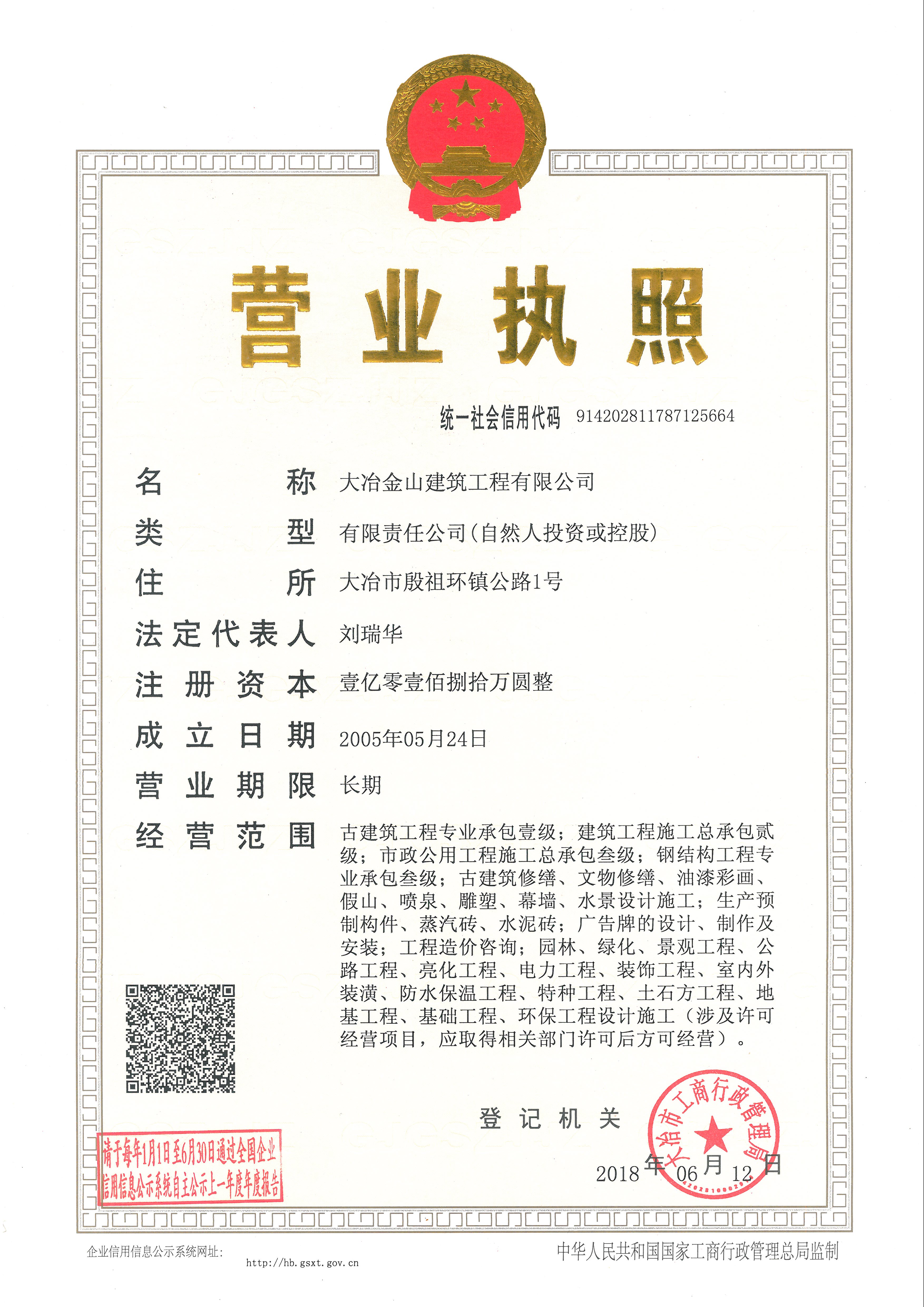 大冶金山建筑工程有限公司始建于1984年,屬鎮(zhèn)辦集體企業(yè)。1997年改制為大冶山建筑工程有限責任公司,屬股份制企業(yè)。2013年更名為大冶金山建筑工程有限公司,2018年3月公司資源重組,公司注冊資金達到10180.00萬元,公司法定代表人為劉瑞華。公司具有古建筑工程專業(yè)承包壹級、建筑工程施工總承包貳級、市政工程總承包叁級、鋼結構工程專業(yè)承包叁級資質。